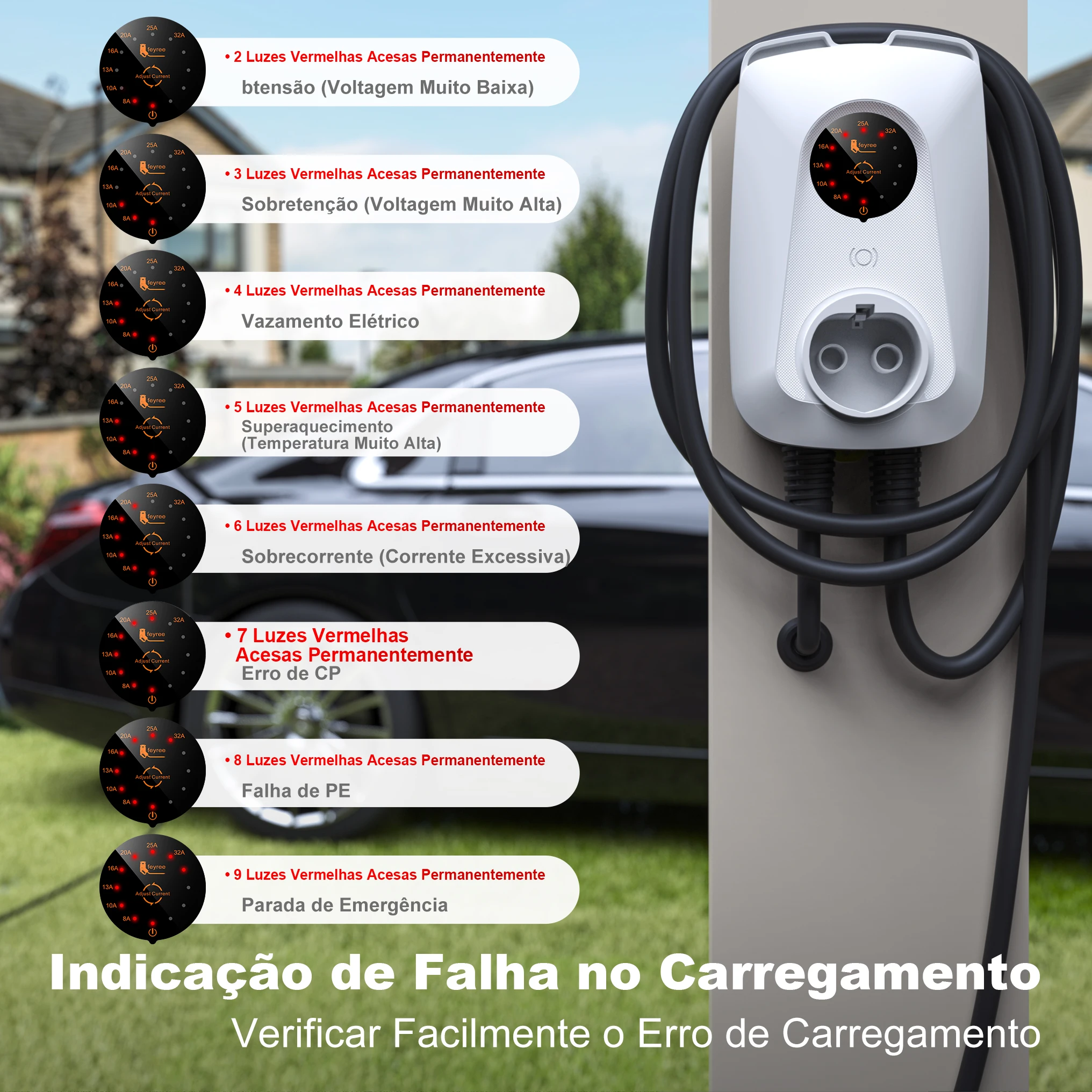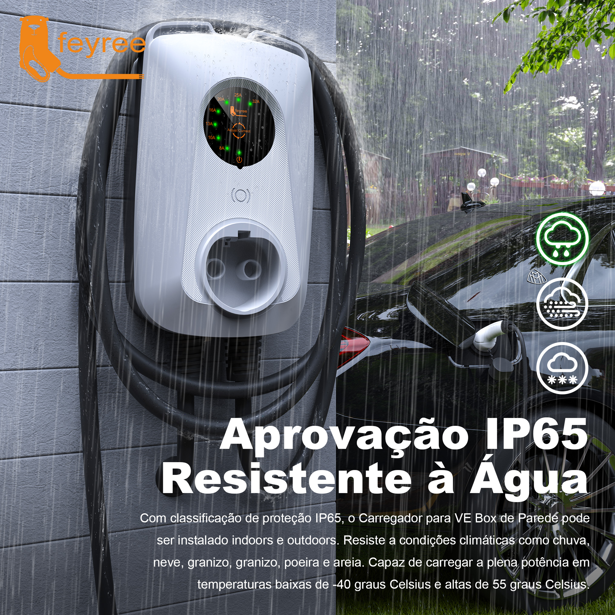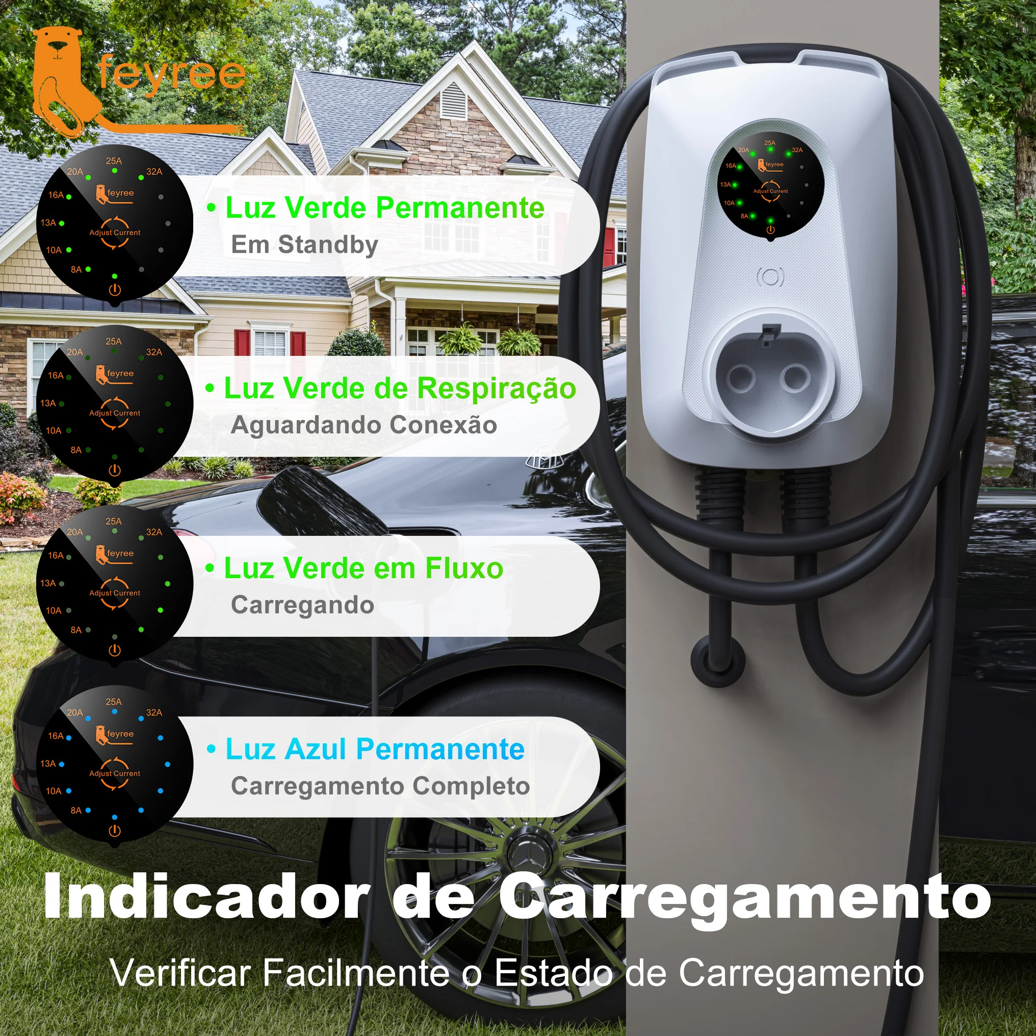 --32A corrente ajustável: suporta comutação livre de corrente de sete velocidades 8A/10A/13A/16A/20A/25A/32A (suporte de veículo necessário), responde de forma flexível a diferentes ambientes de rede elétrica e evita riscos de sobrecarga de linha.